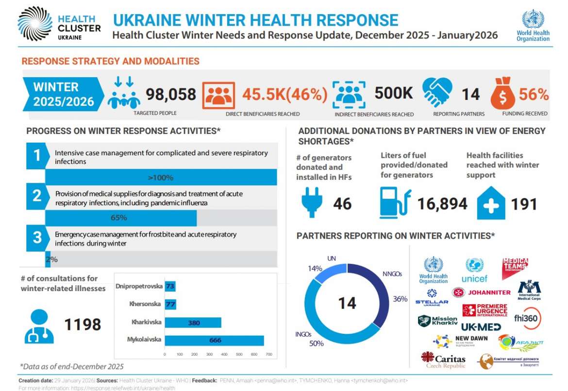 Since December 2025, Ukraine has experienced repeated attacks on energy infrastructure during severe winter conditions, causing widespread humanitarian impacts and heightening risks for households and health facilities due to power, heating, and water outages. Between 27–30 December 2025, damage in Kyiv and across Chernihiv, Dnipro, Donetsk, Kharkiv, Kherson, Sumy, and Odesa oblasts left over one million homes without reliable heat or electricity. In January 2026, disruptions intensi‑ed: on 9 January, nearly 6,000 apartment buildings in Kyiv lost heating and, in some cases, water amid –17°C to –20°C temperatures in northern and central regions; on 19 January, blackouts aected Sumy, Odesa, Dnipropetrovsk, Kharkiv, and Chernihiv oblasts; and on 24 January, approximately 1.2 million properties in Kyiv and Chernihiv regions lost electricity, leaving thousands without heating during extreme winter conditions (–7°C to –1°C on average across the country). These attacks, combined with severe winter weather, have dramatically increased humanitarian and health needs, particularly in northern and central regions, where households and health facilities continue to struggle to maintain heat, water, and essential services.