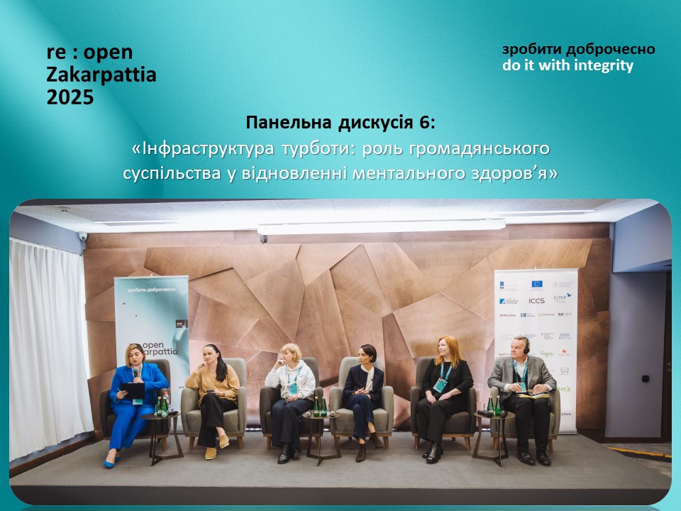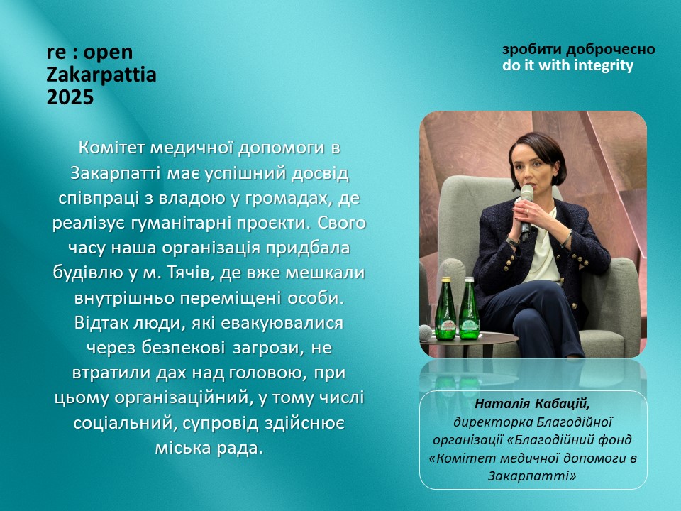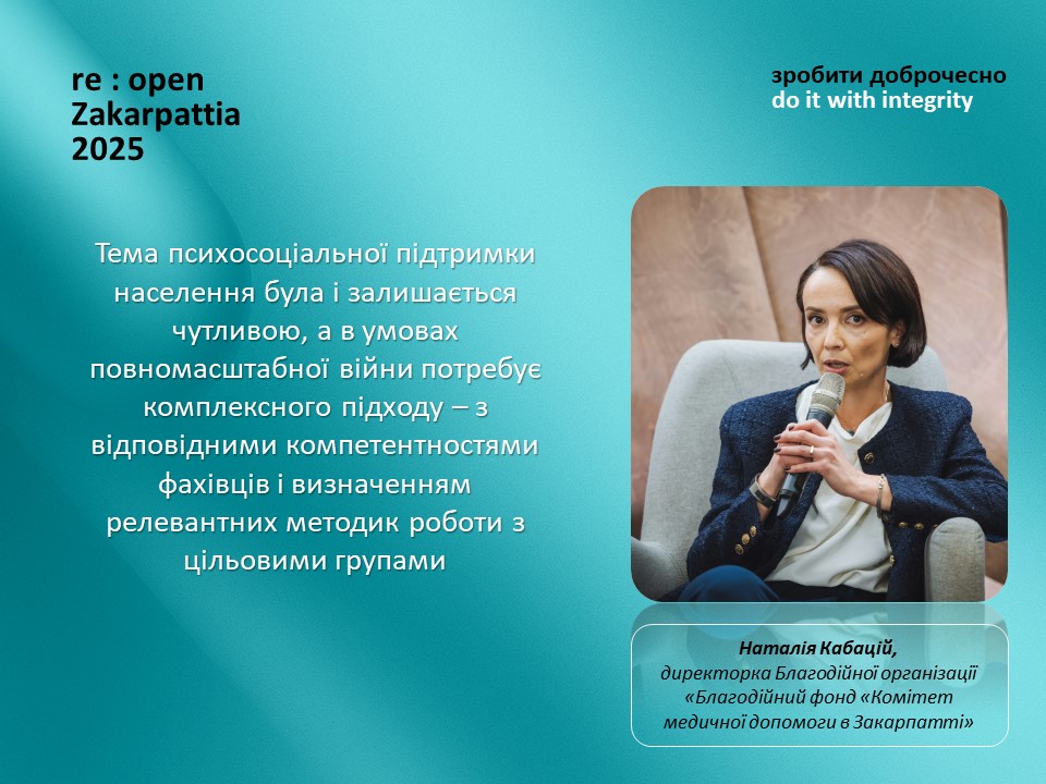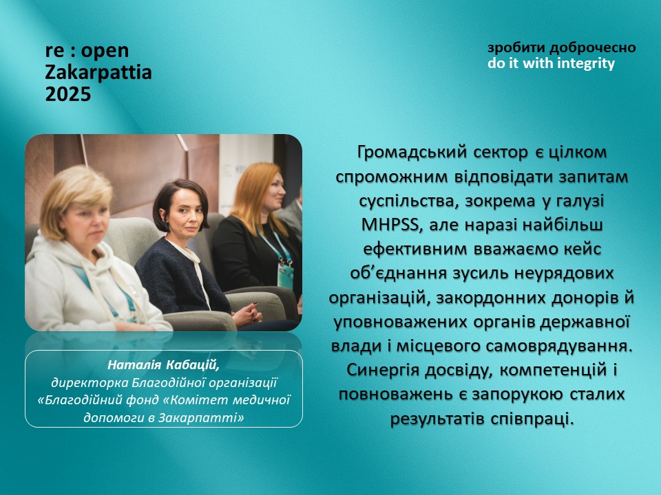 У рамках панельної дискусії «Інфраструктура турботи: роль громадянського суспільства у відновленні ментального здоров’я» до обговорення долучилася директорка Благодійної організації «Благодійний фонд «Комітет медичної допомоги в Закарпатті» Наталія Кабацій. Разом із віцепрезидентом Фонду Роберта Боша, головою спеціального підрозділу з питань України Маркусом Люксом, виконавчою директоркою та засновницею БФ «Твоя опора» Валерією Татарчук, експерткою Координаційного центру з психічного здоров’я Кабінету Міністрів України Анною Соколенко та членкинею ГО «Інститут психосоматики та травмотерапії» Еллою Мусаєвою учасники панелі, яку модерувала журналістка і телеведуча Катерина Трушик, обговорили актуальні питання формування фахового середовища психосоціальна підтримка та його реагування на виклики, пов’язані з психічним здоров'ям населення.